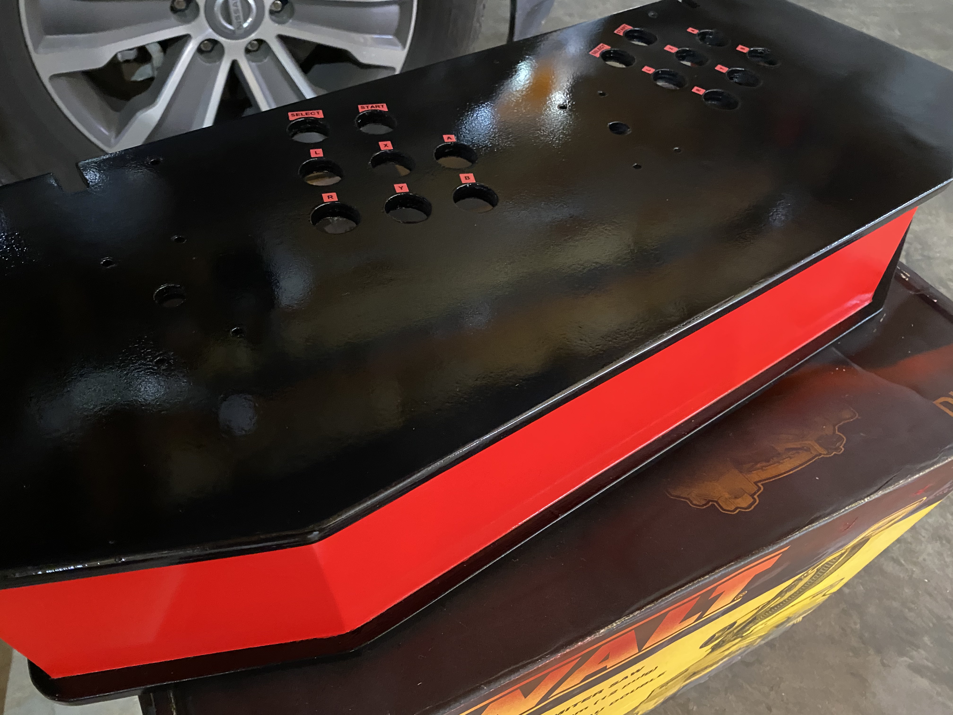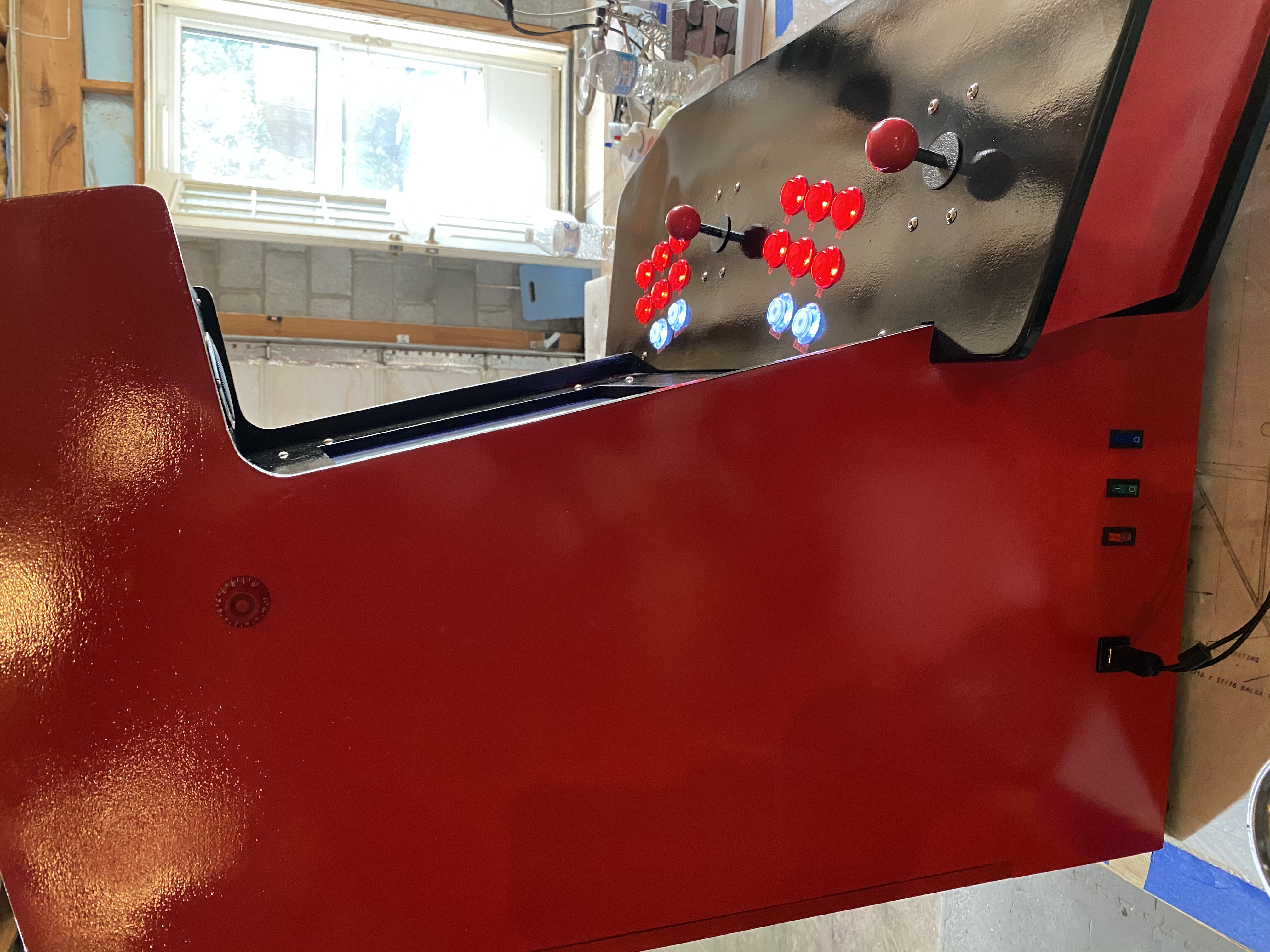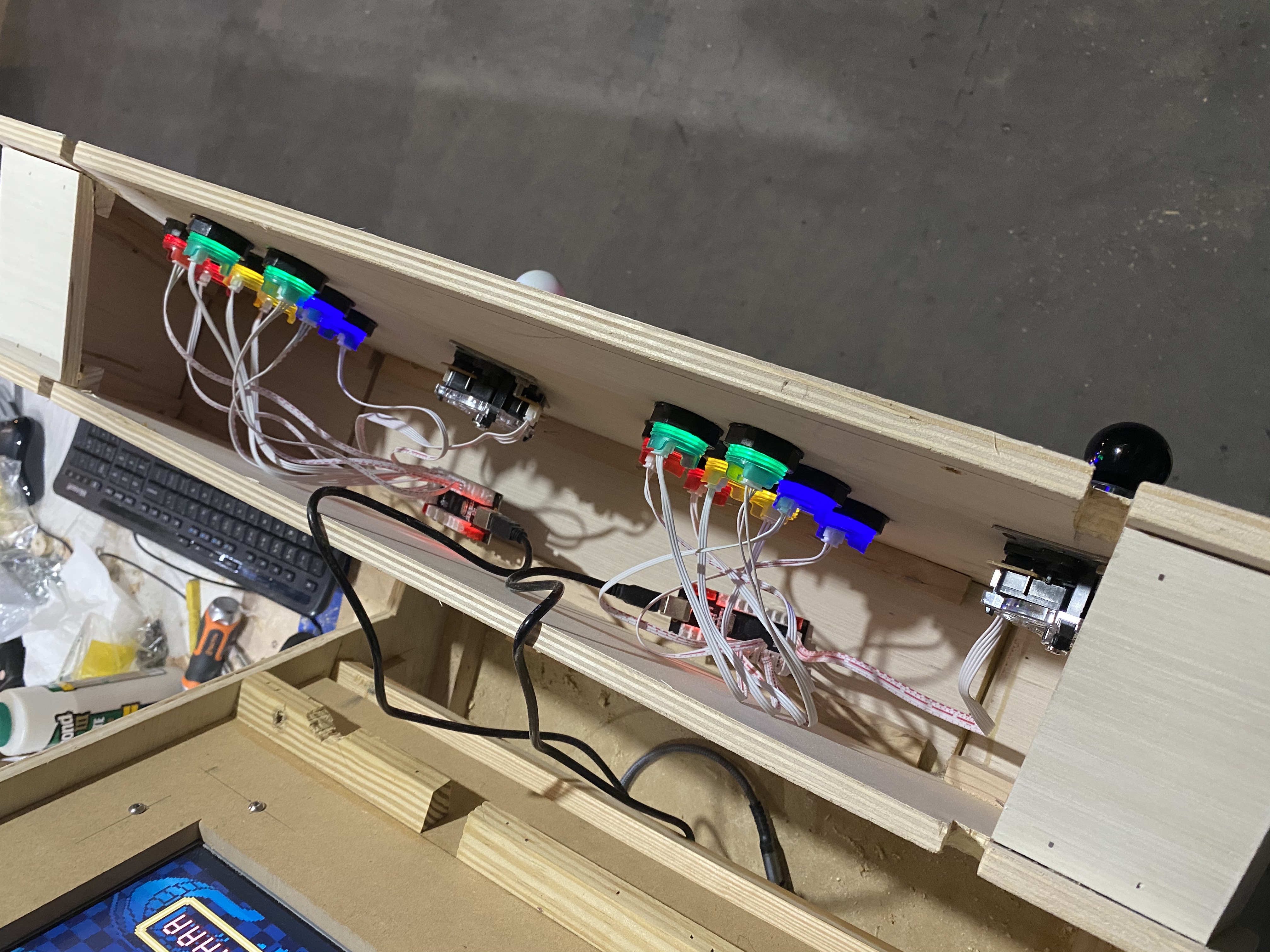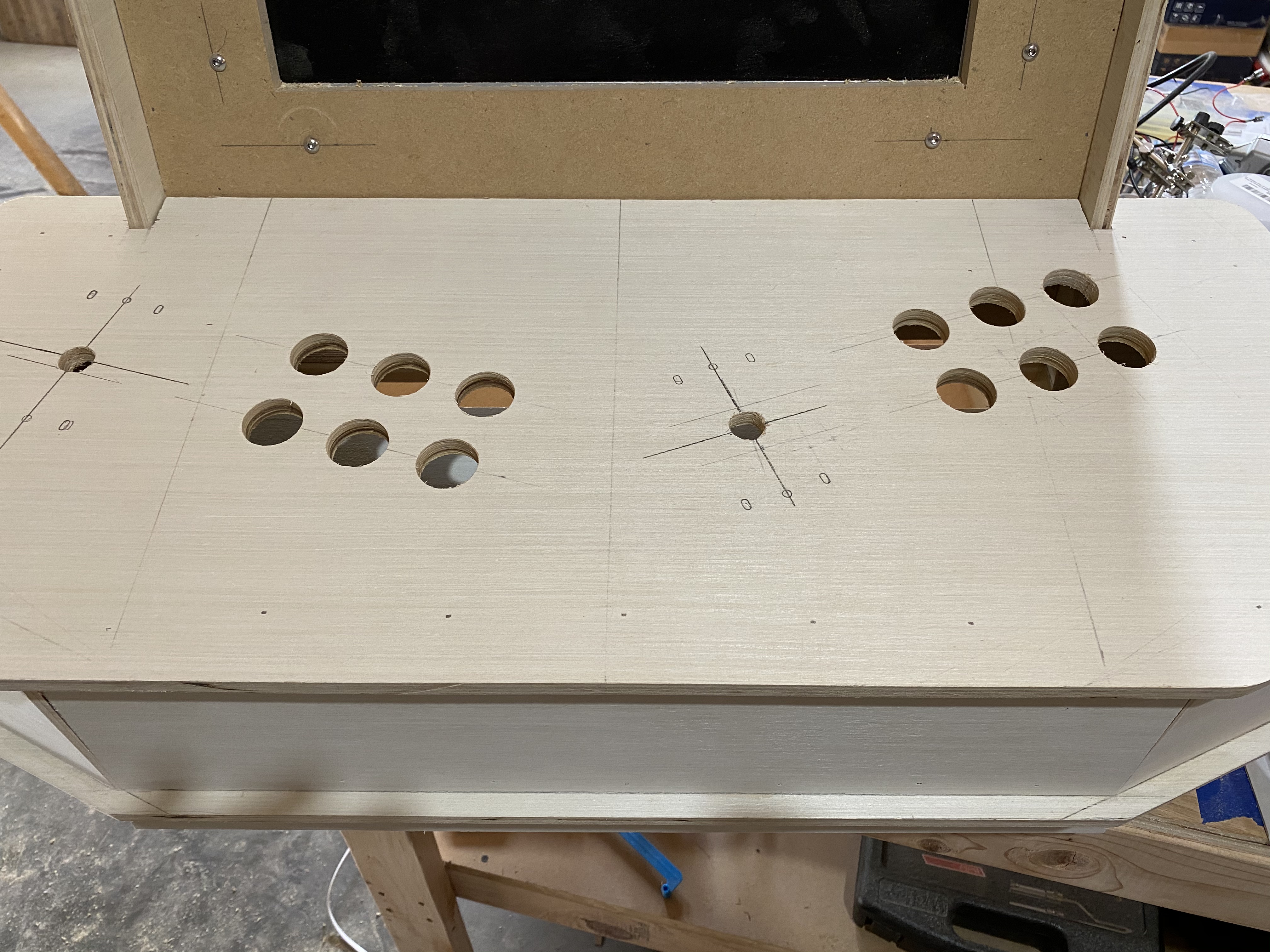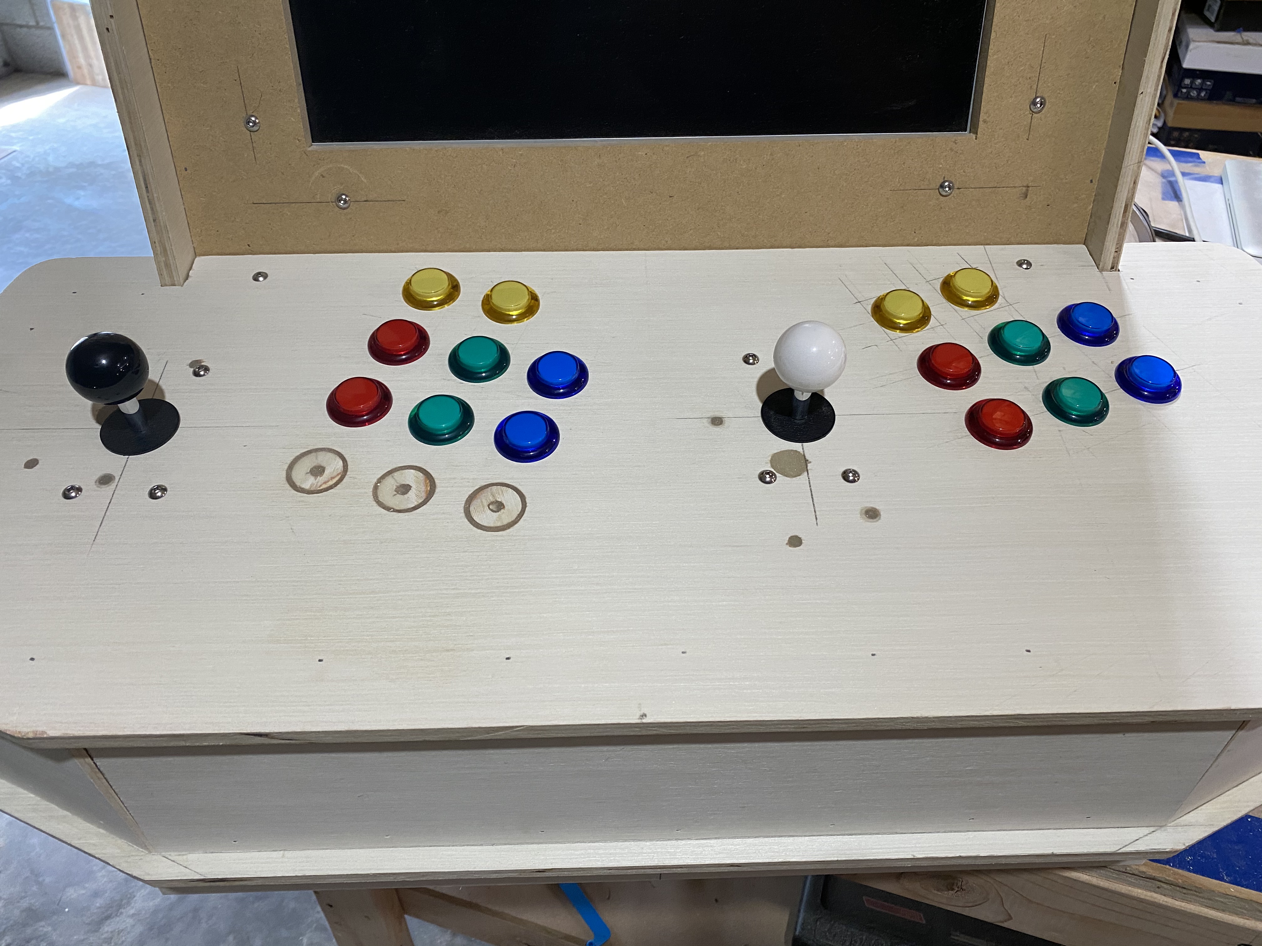 I moved the joysticks and some of the buttons. I refilled the old holes with scrap wood and epoxy.