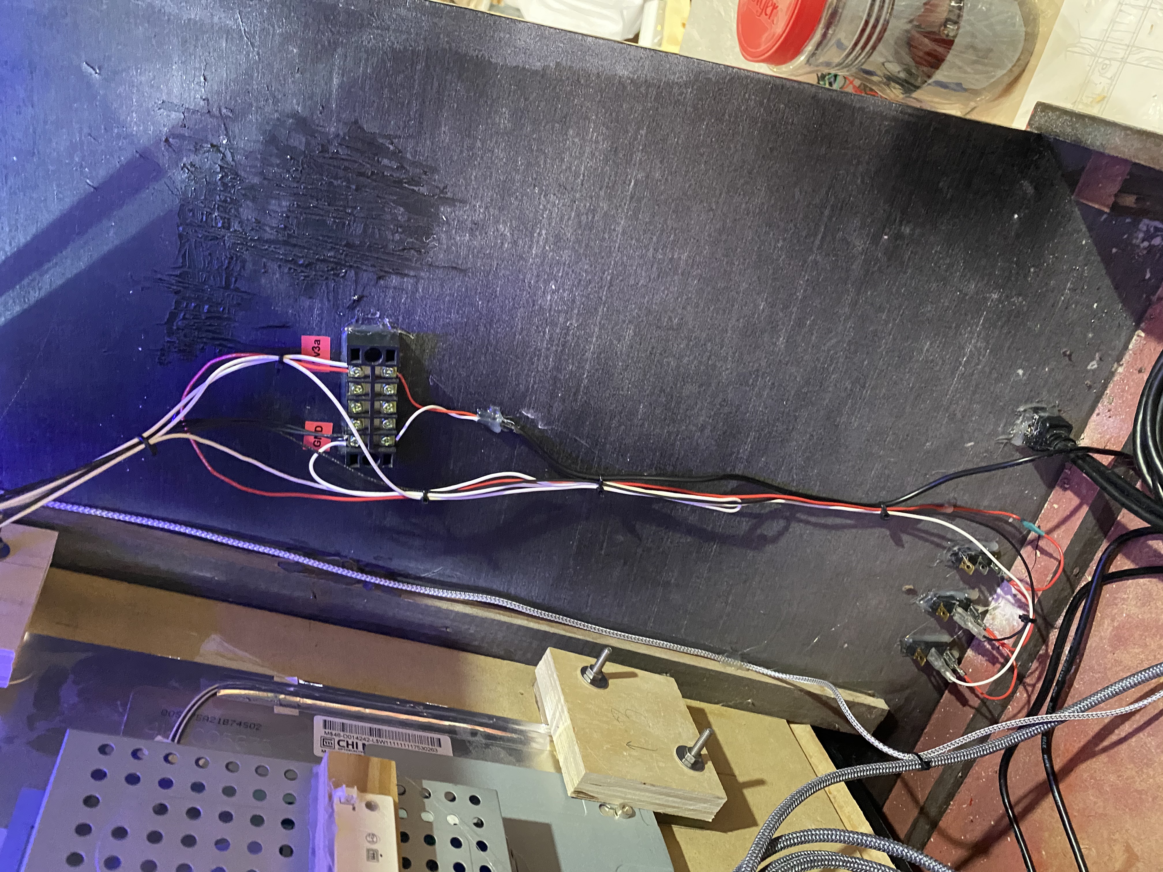 Power bus and switch wiring. 20 gauge wire. Lots of hot glue gun.