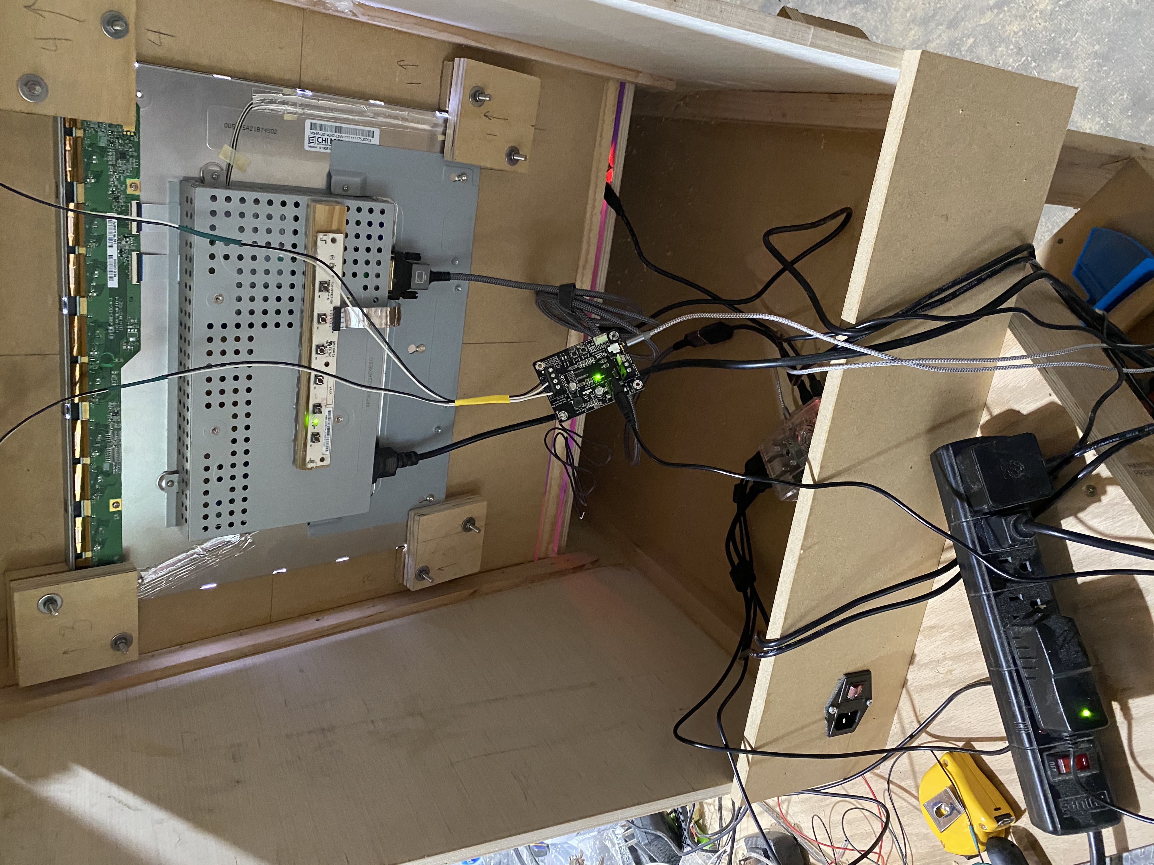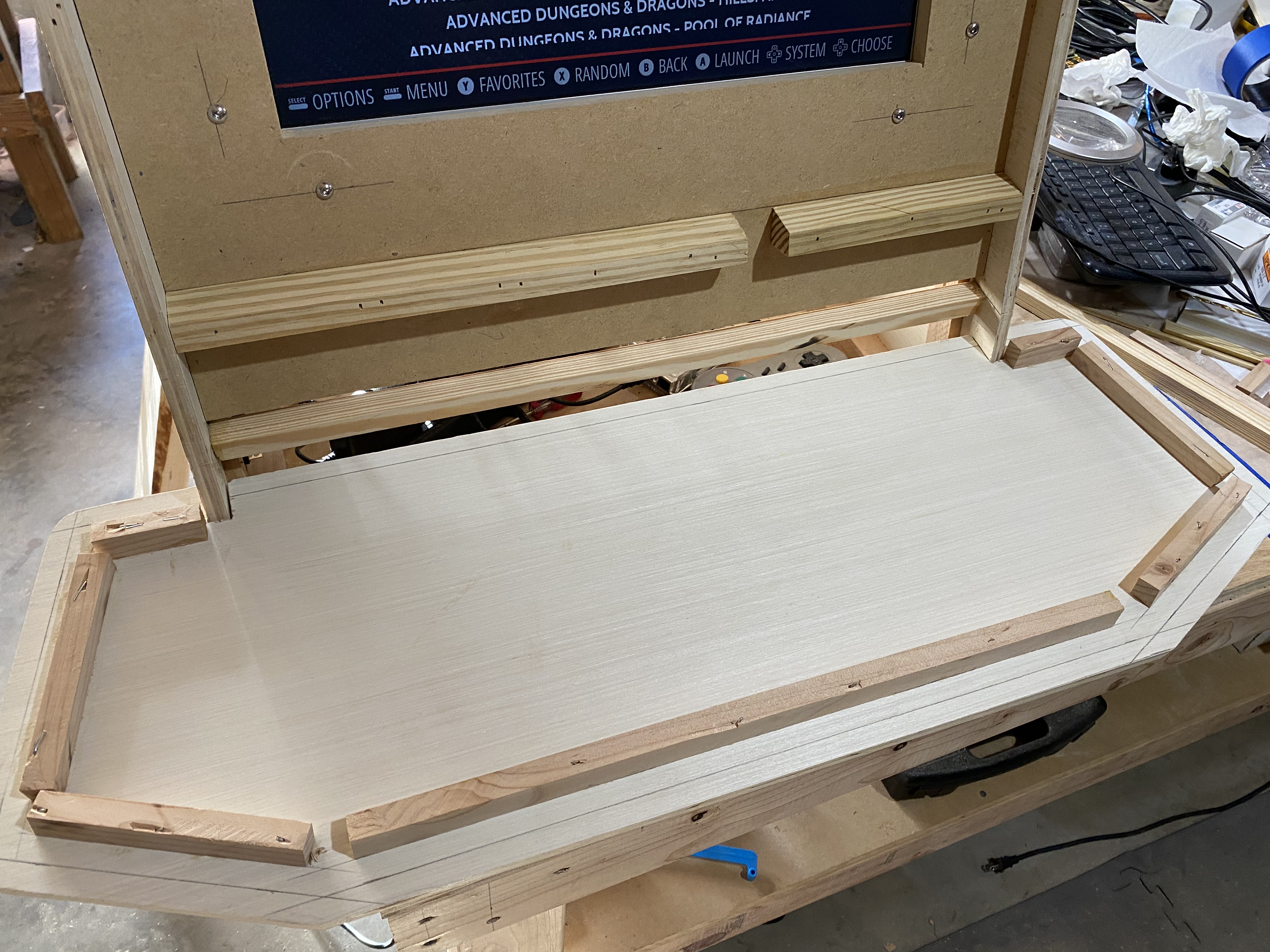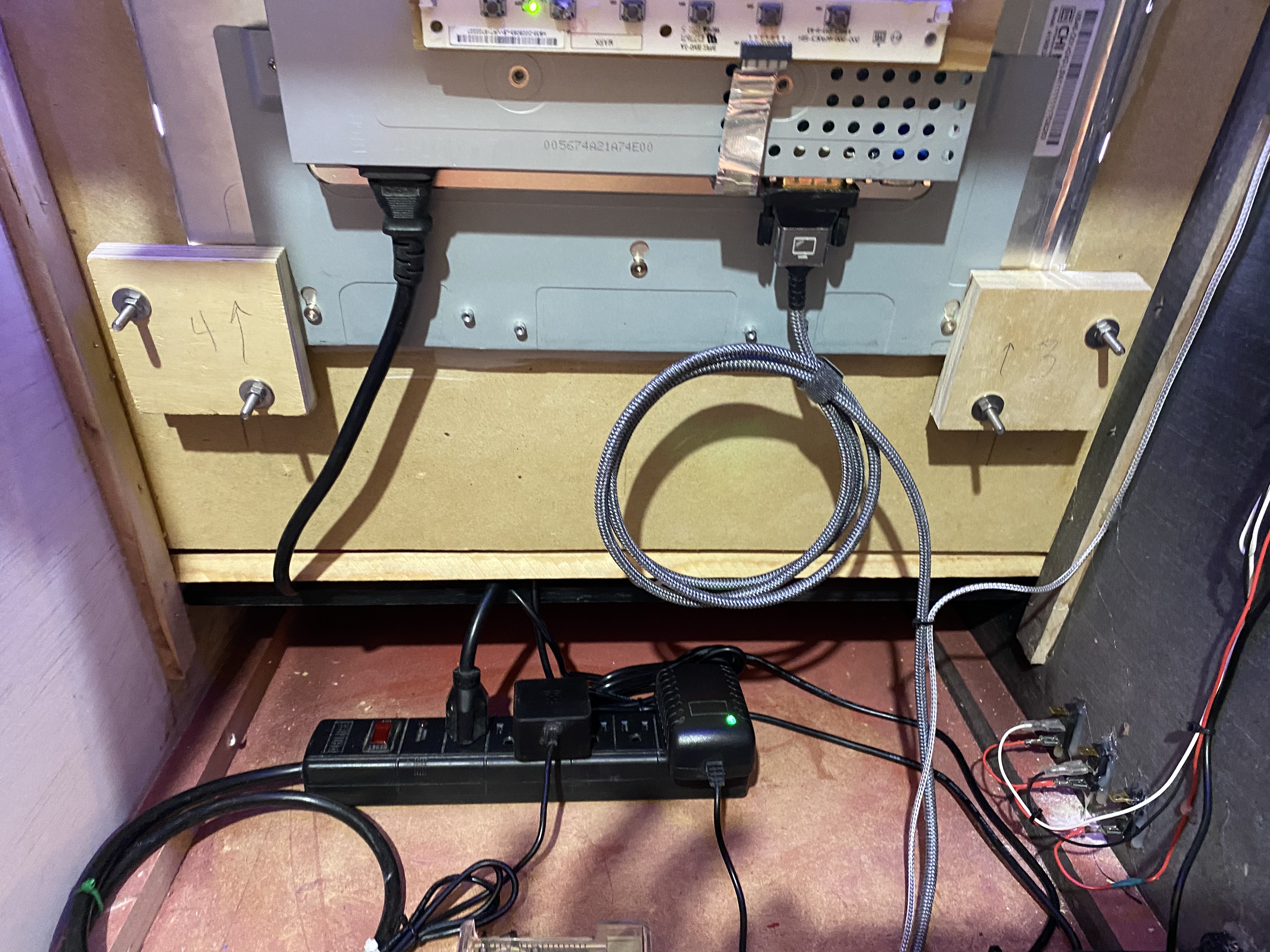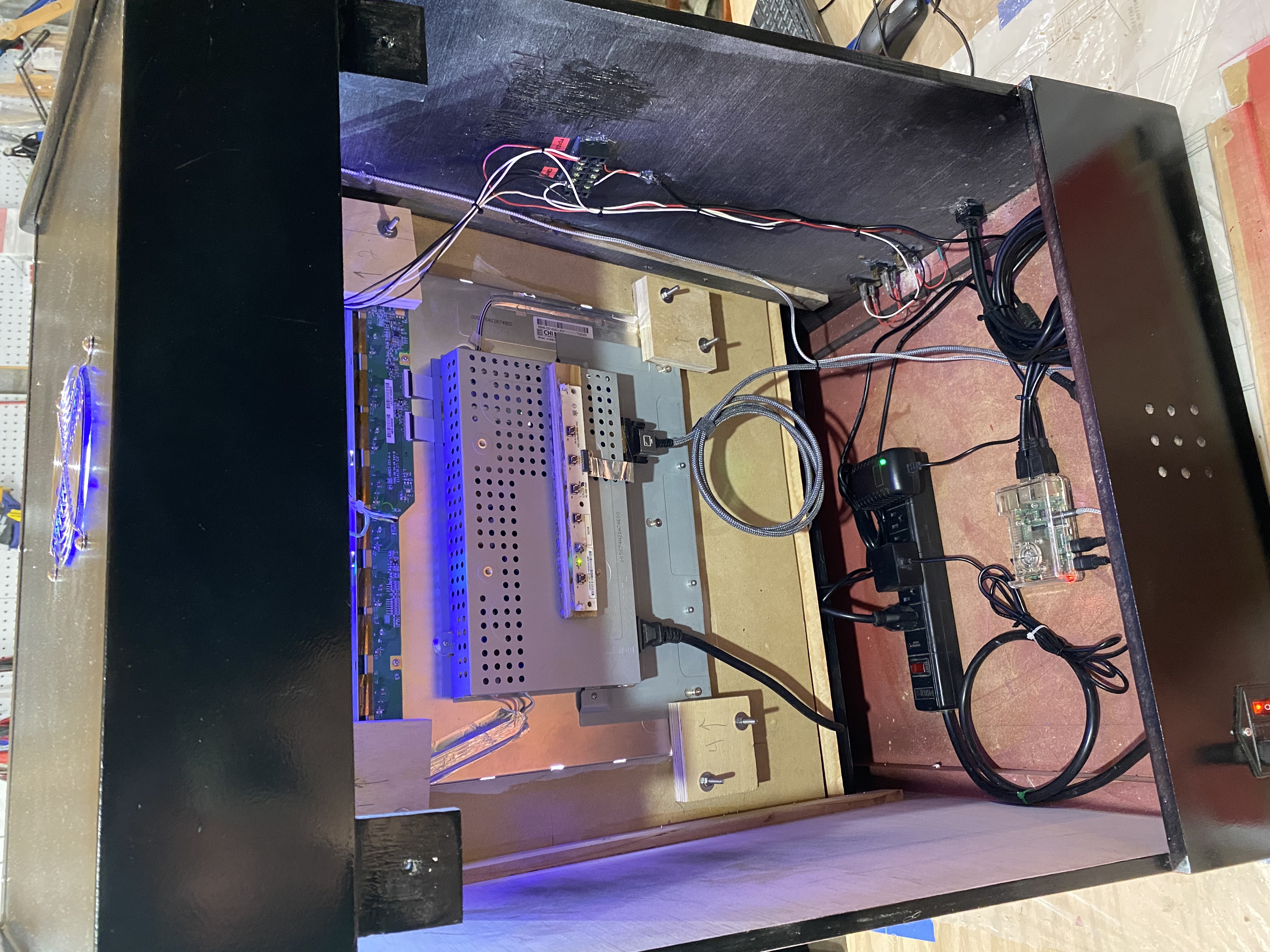 Inside the back you can see the 19" Dell monitor I stripped down and mounted with wood blocking. This particular monitor had a 5:4 ratio, which works great for older console games. I used a hot glue gun to attach the monitor controls to the back of the monitor.